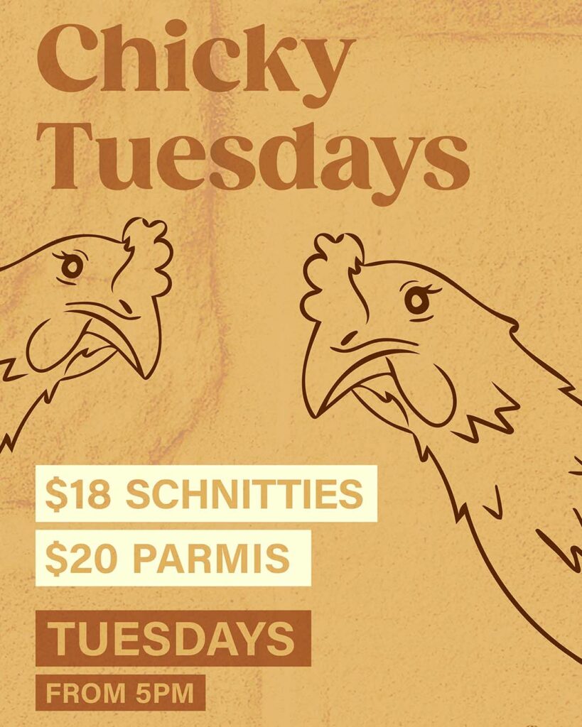 Tuck into the pinnacle of simple pub pleasures, with Classic Chicken Schnitzels for $18 and, “oh go on then” Chicken Parmi’s for $20. Our Parmi’s are exclusive to Tuesday nights only so why not get cheeky, every Tuesday from 5pm. Book a table or walk on in.