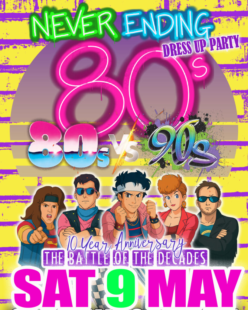 NEVER ENDING 80S PRESENTS: 80S V 90S THE BATTLE OF THE DECADES – DRESS UP PARTY – 10 YEAR ANNIVERSARY