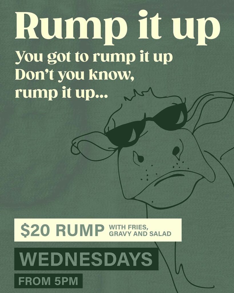Its time to Rump it up at Greenwood Hotel with our 250g Rump Steak for just $20, served with fries, parmesan and rocket salad and peppercorn gravy (GF, DF).